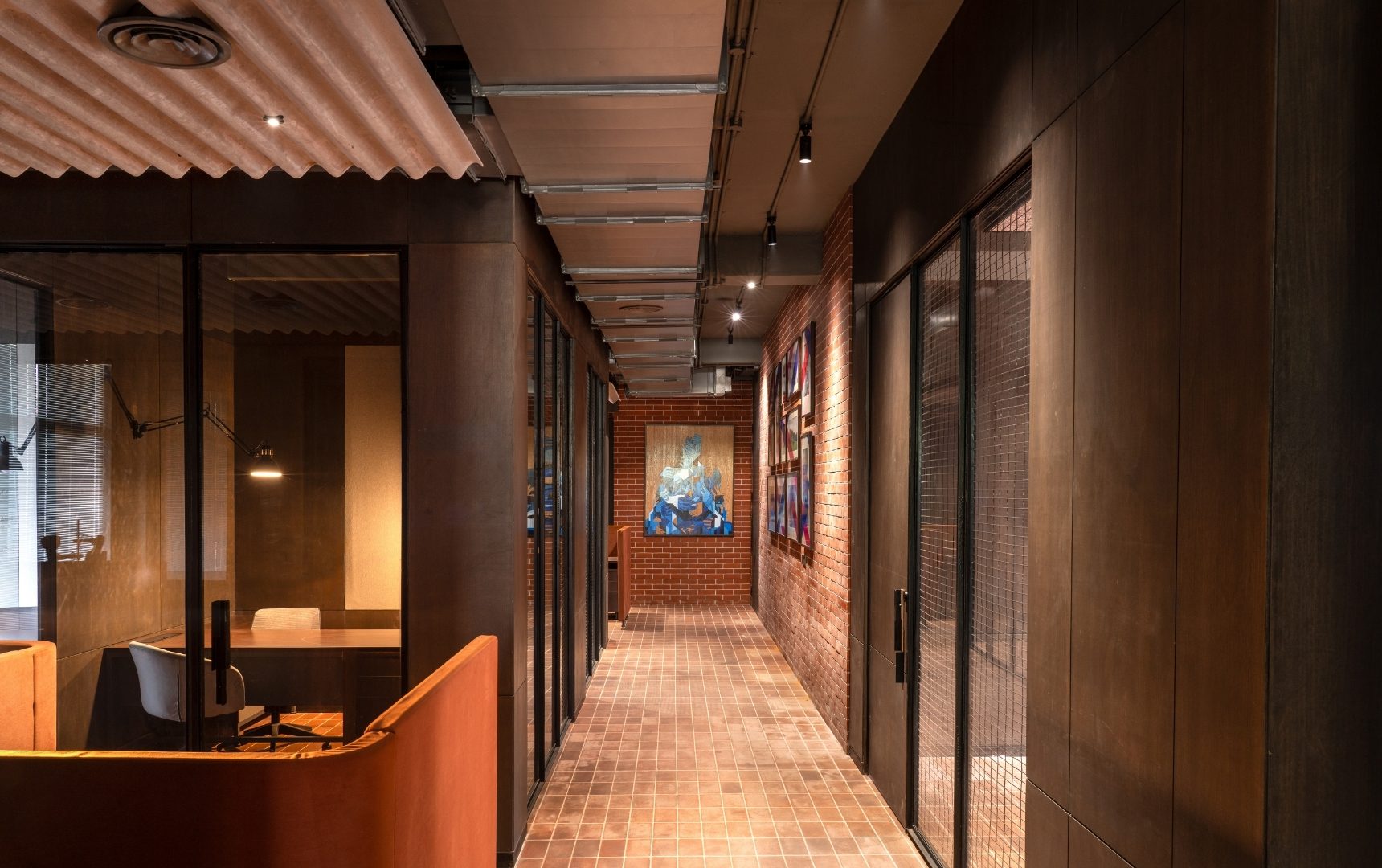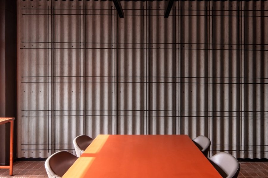 The project makes use of leftover site resources, integrating them into the spatial fabric. Salvaged bricks are reused to construct feature walls, surplus steel is reimagined as partitions and furniture, and corrugated cement sheets add texture and depth to the interiors. Smaller elements – such as extra wooden planks and metal fittings – are incorporated into built furniture and detailing, underscoring the project’s ethos of resourcefulness. Complementing this material-conscious approach,